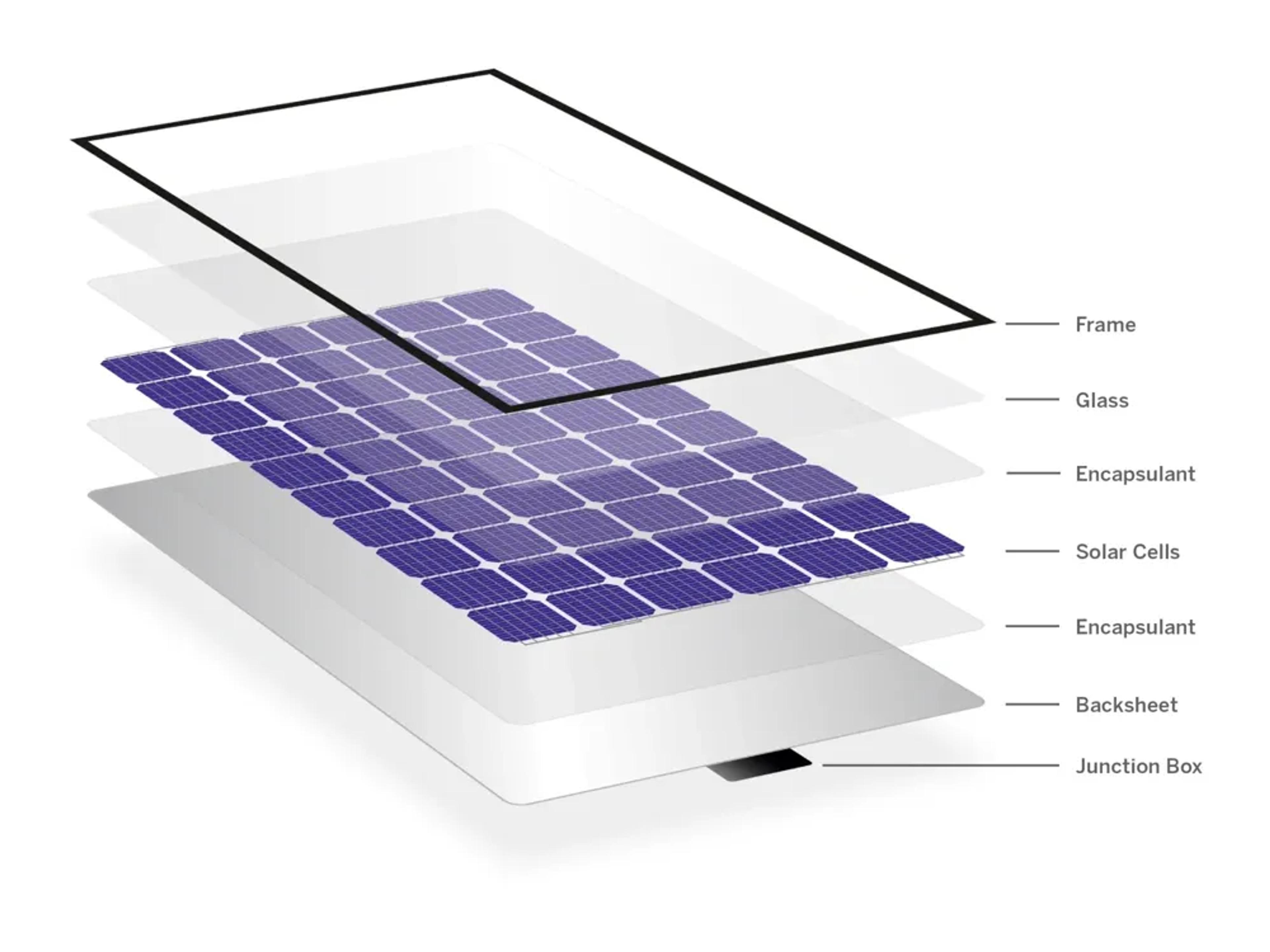 Er zijn verschillende soorten zonnepanelen, maar bij Otovo gebruiken we enkel zogenoemde fotovoltaïsche of PV panelen. Deze panelen bevatten een reeks halfgeleidercellen die ingebed zijn tussen een glasplaat en een achterplaat, dat meestal van wit EVA plastic is gemaakt. Om dit geheel te kunnen monteren wordt een aluminium kader gebruikt dat aan de rand van de glasplaat bevestigd is. PV panelen zijn in staat om zonne-energie in elektrische energie om te zetten en het zijn die voorgenoemde halfgeleidercellen, of zonnecellen, die hierbij een cruciale rol spelen. Hier gaan we verder dieper op in.